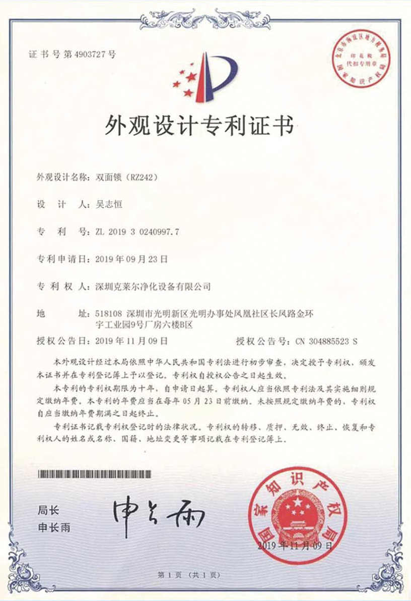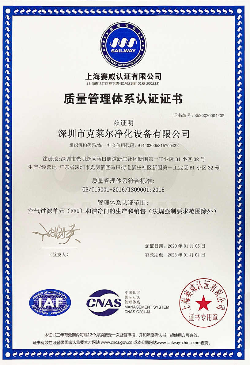 廣東克萊爾潔凈科技有限公司是一家集生產(chǎn)、研發(fā)、銷售于一體的專業(yè)潔凈門窗生產(chǎn)企業(yè)。 公司擁有現(xiàn)代化標準廠房10000多平方米,配備全自動靜電噴涂流水線及 3000平以上萬級無塵生產(chǎn)車間,專供潔凈門及中空窗的生產(chǎn)裝配等。公司不斷引進一流生產(chǎn)設(shè)備(如瑞士百超激光切割機、日本AMADA數(shù)控折彎機、超聲玻璃清洗機等),采用國際最先進的技術(shù)及裝備確保產(chǎn)品品質(zhì),是華南區(qū)域最具規(guī)模的專業(yè)潔凈鋼制門及中空潔凈窗生產(chǎn)廠家。公司在同行業(yè)率先通過ISO9001質(zhì)量體系認證,并先后獲得多項專利認證及榮譽證書。 KLE purification equipment Co., Ltd. is a set of production, research and development, sales in one of the professional clean doors and windows production enterprises.The company has a modern standard workshop of more than 10000 square meters, equipped with automatic electrostatic spraying line and more than 30 million level dust-free production workshop, specially for the production and assembly of clean doors and hollow windows. The company constantly introduces first-class production equipment (such as Swiss Baichao laser cutting machine, Japanese AMADA CNC bending machine...